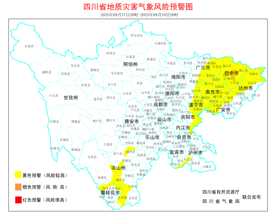 9月17日20时到18日20时:巴中、南充、遂宁3市,广安、达州、泸州3市西部,广元、绵阳、资阳、内江、自贡、宜宾6市东部有暴雨和大暴雨(雨量70~120毫米),局地最大累计雨量可达220~260毫米,最大小时雨强50~80毫米;盆地北部的部分地点有短时阵性大风。另外,攀西地区中部南部有大雨到暴雨(雨量30~60毫米)。